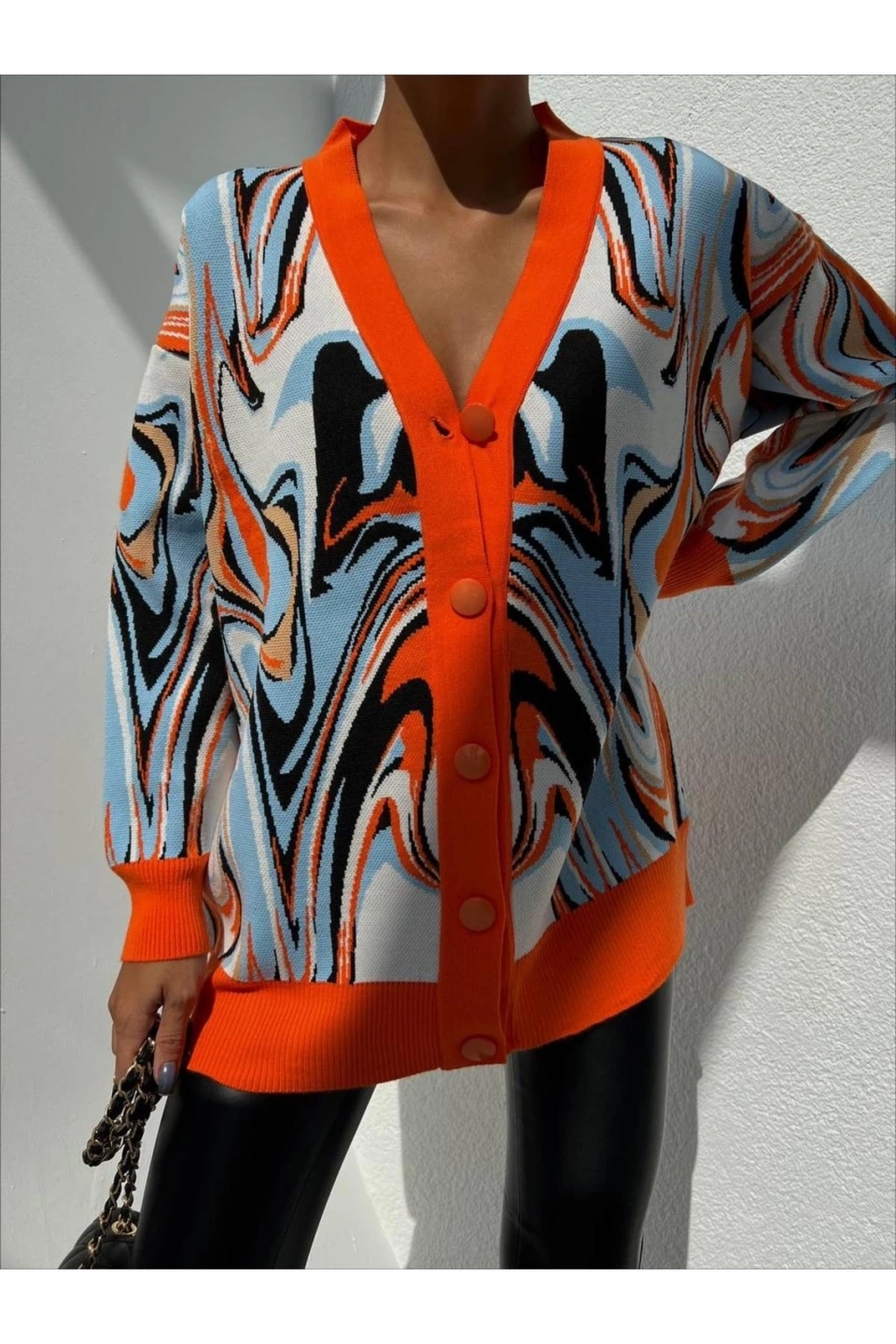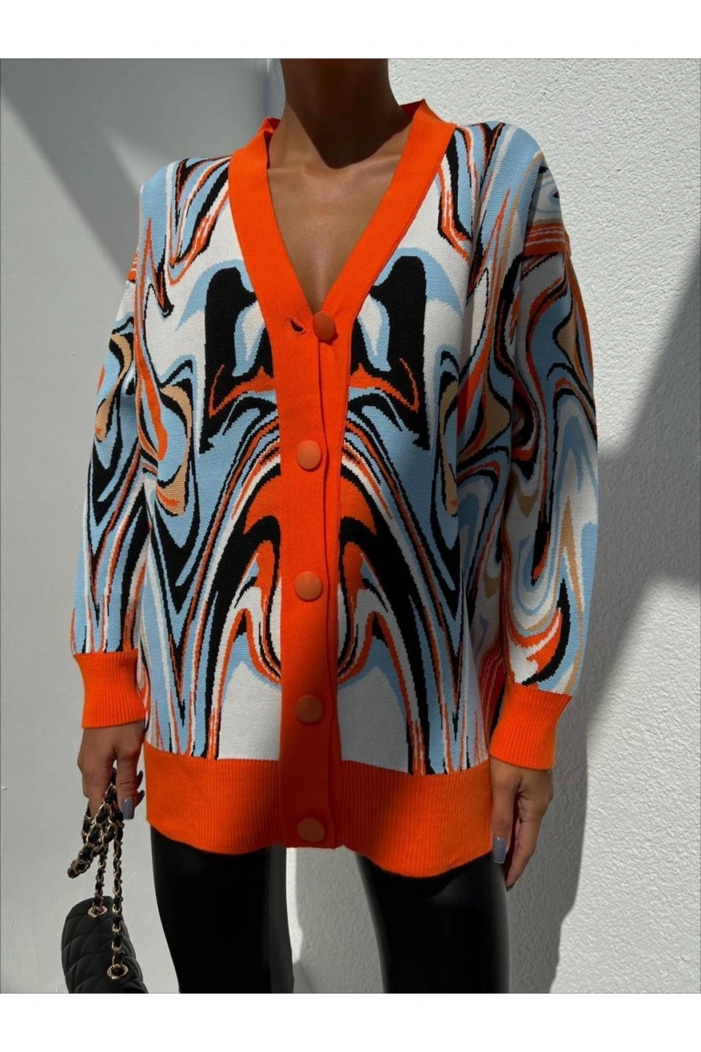 V Yaka Düğmeli Oversize Ebruli Desen Hırka